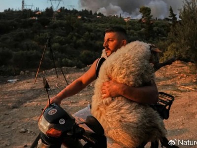 在希腊第三大城市帕特雷附近一座尘烟滚滚的小山坡上,一名男子开着电瓶车,抱着绵羊下山——既紧急又温柔的一刻,因为此时野火正席卷山坡上的居民区。这张照片由美联社摄影师Thanassis Stavrakis拍摄于八月中旬的一个傍晚。画面展现出场景的紧迫,也展示了更广泛的现实:南欧野火造成的损失日益严重,和那些不愿抛下动物的人们英雄主义的静静坚守。
