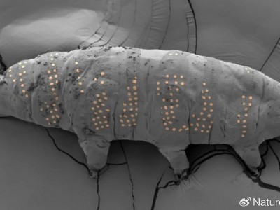 这只水熊虫身上缀着超级迷你的“纹身”。研究者用一种电子束在覆盖这个动物体表的一层冰上刻出了小点。电子束将物质转化为粘附在水熊虫表皮的化合物,在其余冰层蒸发后会显现出来。开发这个技术的科学家说,这种方法精度极高,意味着能应用于生物医学工程。他们正在研究用同一方法在更小的生物(比如细菌)上“纹身”。