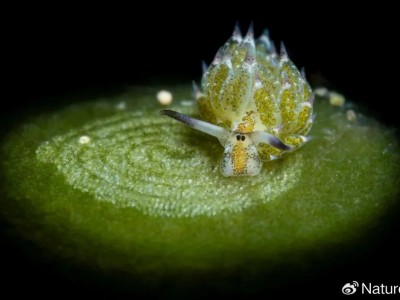 这种海蛞蝓(Costasiella kuroshimae)吃下藻类,将叶绿体藏进自己的细胞里,从而捕获阳光,通过光合作用产能。它的名字(sheep nudibranch,“绵羊海蛞蝓”)来自头部两侧看起来像羊耳的感觉器官。这张照片中,摄影师Giancarlo Mazarese拍到了它螺旋式产卵的时刻。它是年度海洋摄影师奖的系列获奖作品。