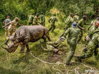 在保育工作的努力下,肯尼亚的黑犀(Diceros bicornis)从濒临灭绝中恢复过来,但保护它们的工作十分艰难。这张照片获得了2025年BigPicture野生动物摄影大赛奖项,展现了一个团队正在治疗患病犀牛,展示出安全控制这些强大动物所需的技能与合作——即使犀牛处在镇静状态下。