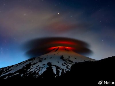 夜幕降临时,智利的Villarrica火山喷发的熔岩照亮了两个圆圆的云环。这一场景由定期前往火山监控其活动的摄影师Francisco Negroni拍摄。