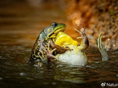 这是2025年尼康搞笑野生动物摄影大赛的获奖作品,它让我眼前一亮,笑了出来。这里是两只雄蛙(Lithobates clamitans)为领地打斗的场景。这张照片由Grayson Bell所摄,这位才华横溢的13岁摄影师起了个天才的标题是“非自愿皈依者受洗”。