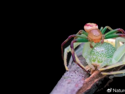 这是一对蟹蛛的求偶,由摄影师Sandip Guha摄于印度西里古里,凸显出雄性与雌性的体型差异之大:在某些物种中,雌性大小是雄性的60倍。这张照片获得了伦敦相机交易所年度摄影师大赛奖项。
